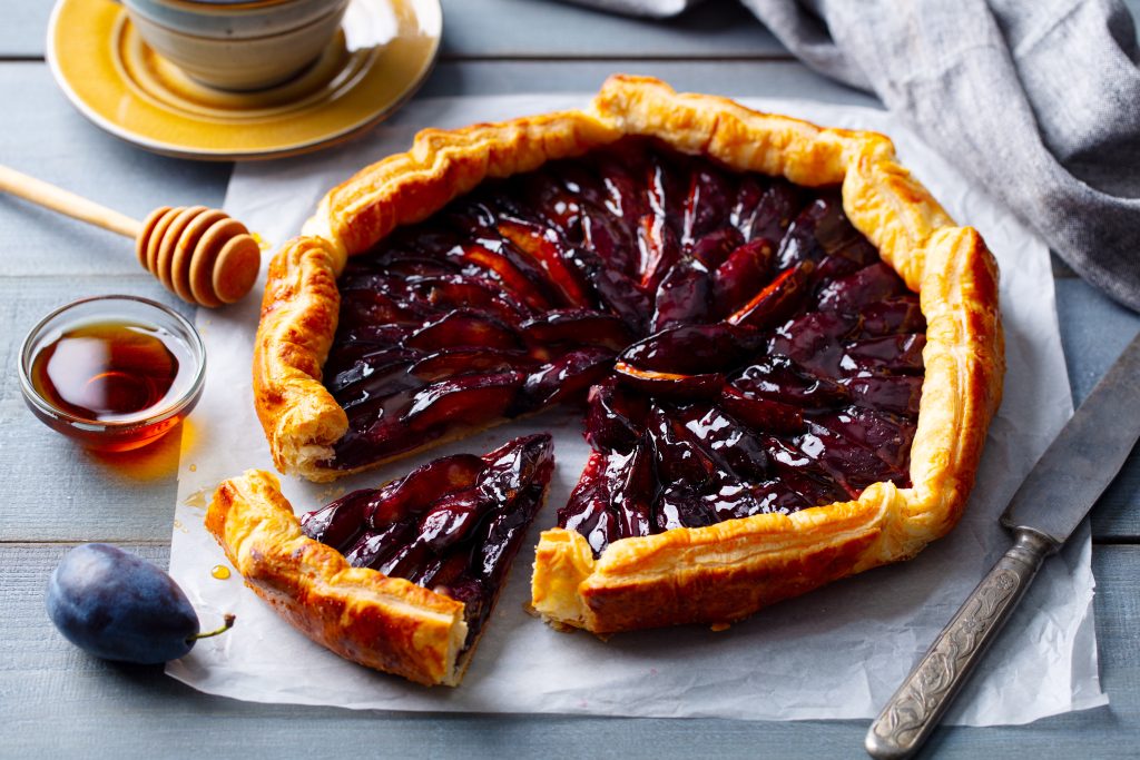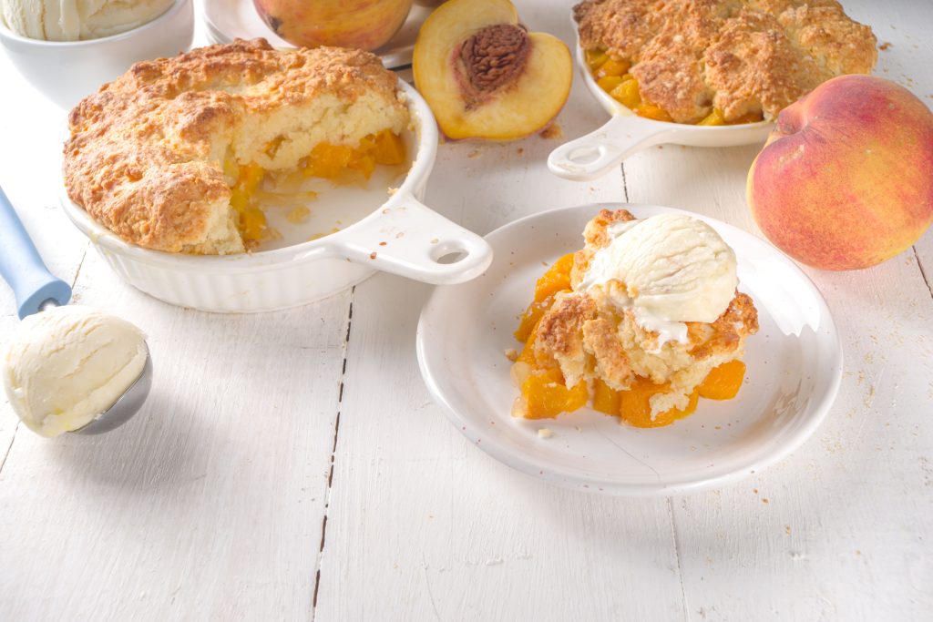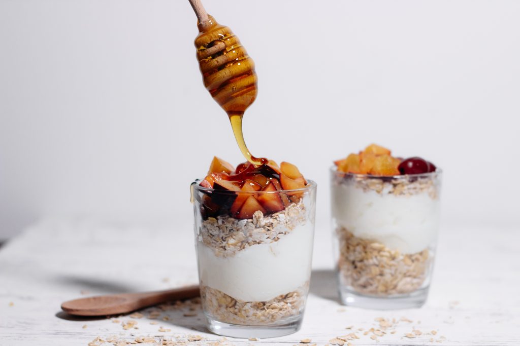 Perzikcrumble met bloemenhoning en vanille-ijs