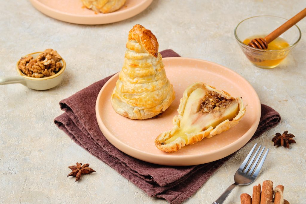 Kweekpeer-kwarkmuffins met bloemenhoning